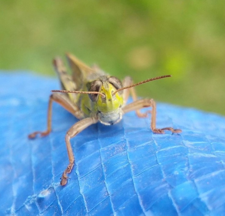 Grasshopper on a tarp covering a gravestone at First Parish Burying Ground Newbury, MA.